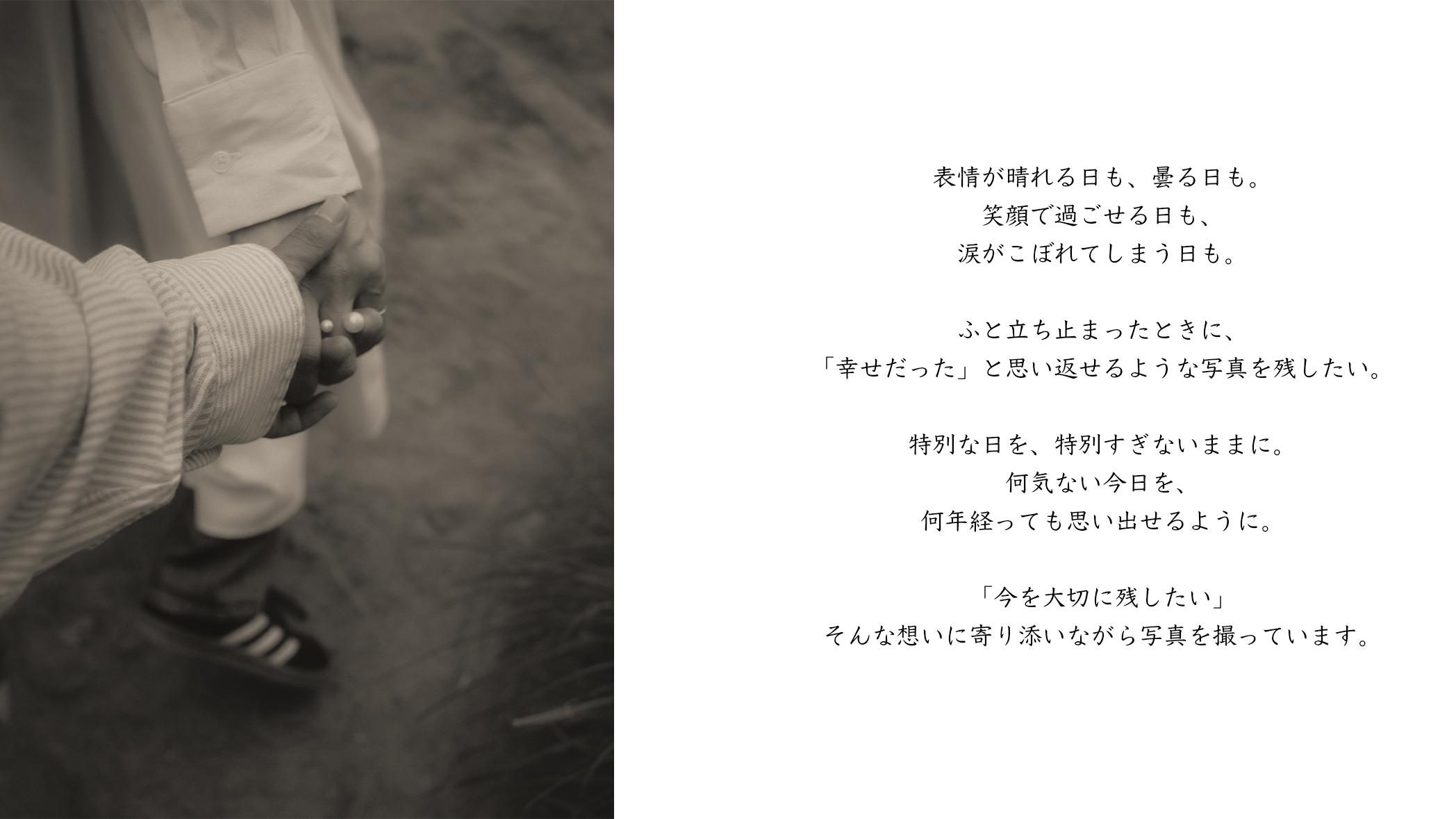 各種撮影プラン・料金のご案内ページです。撮影を通して、大切な人や家族、自分自身を愛せるきっかけとなってくれますように。人生の節目も、何気ない一日も、今を残したいと思う皆様の心に寄り添いながら写真を撮っています。